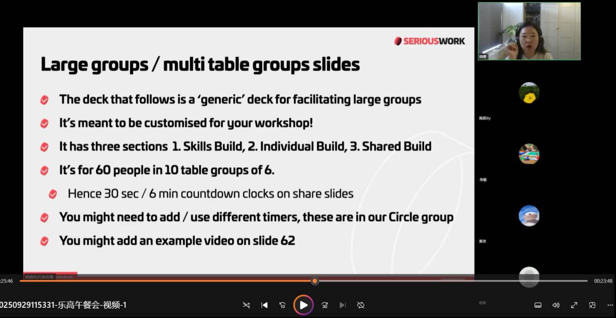 9月29日,一场专属 SeriousWork 毕业生的交流活动 ——“SeriousWork 毕业生云午餐” 顺利举办,来自北京、上海、深圳、苏州各地的7位伙伴全程参加。本次云午餐以乐高工作法引导技术经验分享为核心,汇聚 SeriousWork 毕业生群体,围绕大型工作坊设计与引导的关键环节深入探讨,内容涵盖客户需求沟通、活动设计原则、现场引导技巧等,同时针对多人引导场景中的挑战与应对策略展开讨论,成为 SeriousWork 毕业生间互通经验、延续社群联结的重要平台。